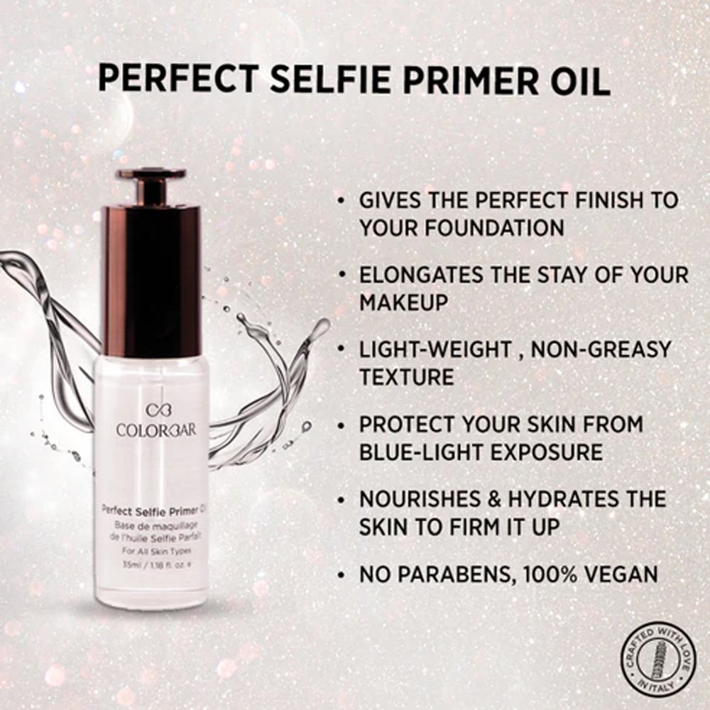 Perfect Selfie Primer Oil is a hydrating and firming primer oil that focuses on protecting your skin from blue-light exposure and providing long-lasting makeup results. Colorbar Perfect Selfie Primer Oil contains advanced ingredients that give your skin digital protection so that your skin can breathe better. The texture is so lightweight and non-greasy that it feels almost invisible once blended and leaves behind a fresh, hydrated appearance. With this primer oil, you are always ready for that perfect dewy selfie!